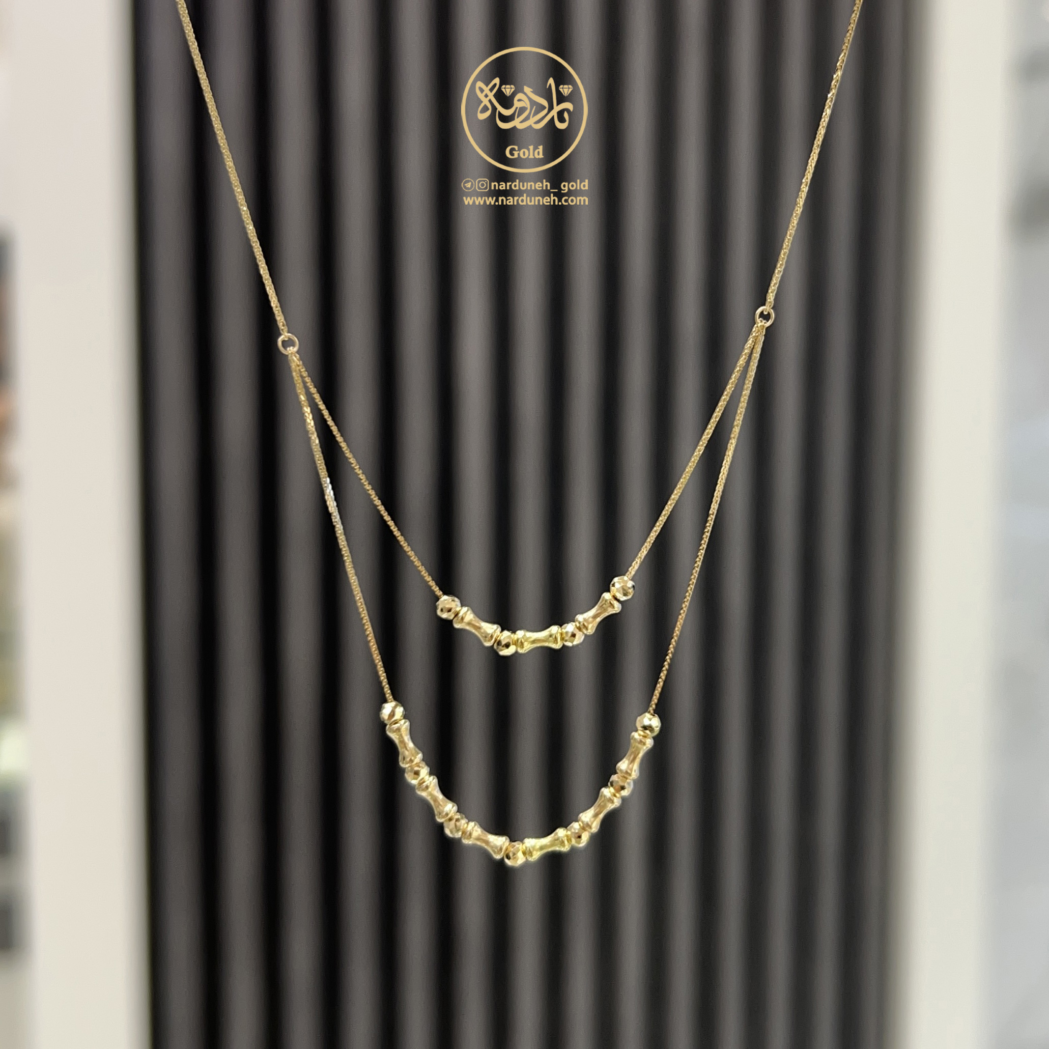 این گردنبند با دقت بالا و از جنس طلا 18 عیار ساخته شده است. طراحی دو ردیفه آن حجم و عمق بصری جذابی ایجاد کرده مهره های استخوانی به کار رفته در میان زنجیر تضاد و بافتی جذابی پدید آورده که این محصول را منحصربهفرد میکند.